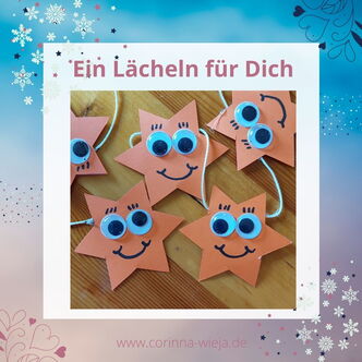 Schneide aus Tonkarton in Farben deiner Wahl Sterne aus. Male ein Gesicht drauf. Für die Augen kannst Du Wackelaugen nehmen, sie aber auch aufmalen. Klebe auf die Rückseite der Sterne einen Faden. Um die Klebestelle zu verdecken, kannst Du über den Faden noch einen Stern oder einen kleinen Kreis als Sicherung kleben. Hänge die Sterne auf und erfreu Dich an ihrem Lächeln.