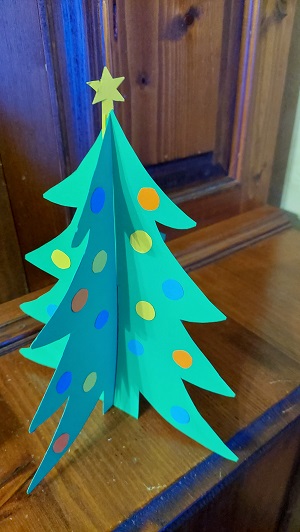 Wenn du keinen grünen Karton genommen hast, kannst du nun deine Bäume anmalen. Schneide nun den einen Tannenbaum in der Mitte von oben bis über die Hälfte hinaus ein. Den anderen Tannenbaum schneidest du von unten bis über die Hälfte hinaus in der Mitte ein. Stecke nun die beiden Tannenbäume ineinander. Dadurch kannst Du die Tanne aufstellen.
